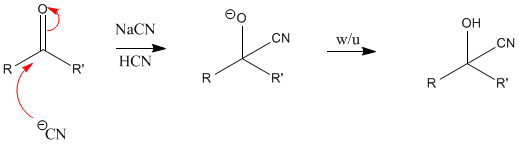 Nucleophilic addition of cyanide ion to carbonyl group