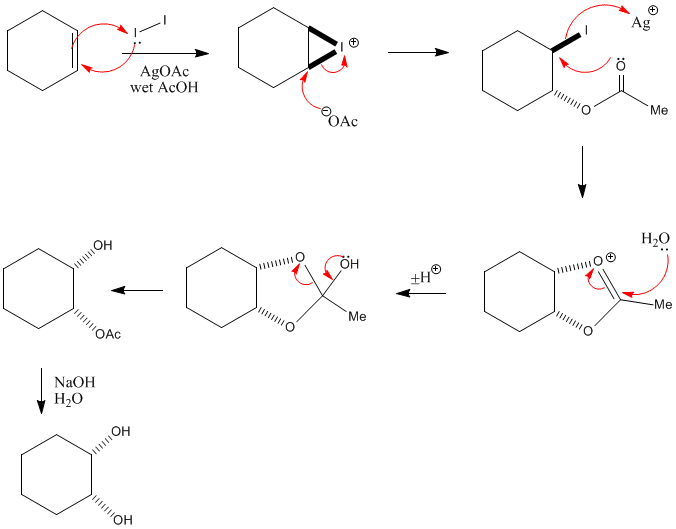 Alkenes- I2 AgOAc, AcOH (wet)- Woodward reaction